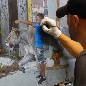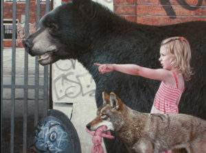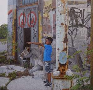 Kevin PETERSON, peintre des Etats-Unis, est très performant dans un style hyperréaliste, avec une technique classique d’huile sur toile. Il a choisi le combat pour l’écologie avec un registre très personnel : la candeur des enfants est associée à la beauté des animaux, pour dénoncer le massacre de notre environnement, en particulier celui des villes. Dans des quartiers délabrés, des villes ruinées, des maisons taguées, des paysages de la laideur urbaine quotidienne, il promène des bêtes et des enfants effarés : la beauté dans la désespérance.
